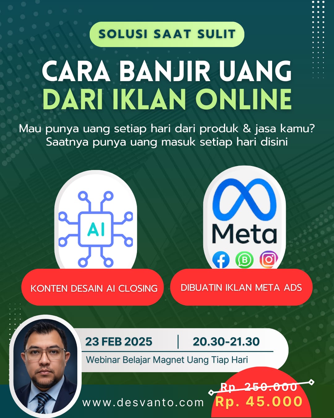 Anda akan mengetahui strategi DAGING Desvanto.com yang bisa menghasilkan ratusan juta bahkan milyaran dari IKLAN AI dan META ADS